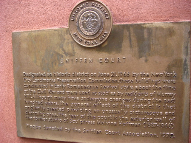 I always like to spell out the plaques, too. It reads: “Sniffen Court – Designated an historic district on June 21, 1966 by the New York City Landmarks Preservation Commission, these buildings were constructed in Early Romanesque Revival style about the time of the Civil War and were used as stables by residents of Murray Hill. Although many have undergone changes during the past hundred years, the general effect of the district is that originally created providing an unusually pictureesque and charming area. The real of the court is the exterior wall of the former studio of Sculptress Malvina Hoffman (1887-1966). – Plaque donated by the Sniffen Court Association 1970.”