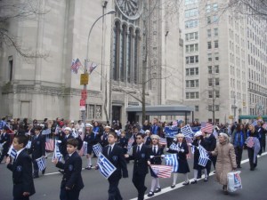 The next group of kids was from the Hellenic Classical Charter School. The little girl in the center (the one with the big, big smile) isn’t looking at me, but at the guys whose heads are painted like the Greek flag. C’mon kid, it’s NYC and they’re way too many of those guys wandering the streets for it to be that unusual. Okay, maybe most of them don’t have the Greek flag…