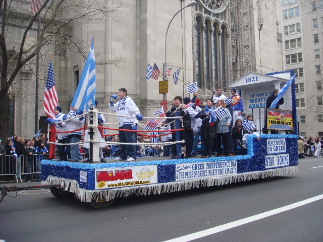 Speaking of which, the next picture was the most unusual float in the entire parade. It was a celebration of Greece and a Greek-American boxer: Mighty Mike Arnaoutis. His float was a bit of bragging: that Mike is “The Pride of Greece” and a bit of politics: “Macedonia is Greek”.