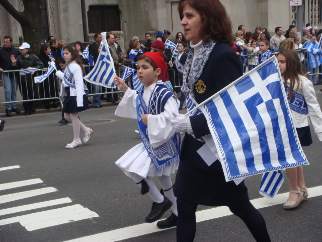 And the Greeks are very family oriented. Lots and lots of kids in native costume in the parade. I like this picture despite accidentally lopping off the top of the woman’s head.