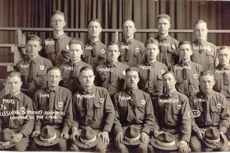 Here he is in 1918. Second row, second from the left. This is the U.S. School of Military Aeronautics in Illinois (I can’t read the name of the place but it looks like “Champanoy”) on May 1, 1918.