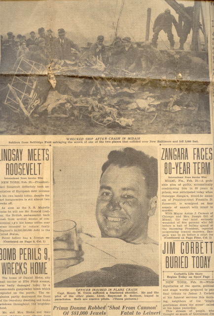 He did have a very nasty accident in an airplane. Below is the front page of the Detroit Times from February 20, 1933. That’s him in his hospital bed and that’s his aircraft (and another guy’s) as a complete wreck. It reads that Captain Henry M. Tunis and Lt. Raymond D. Robison collided and both had to take to their parachutes after a mid-air collision. They were flying in formation and at about 3,000 feet they veered together and collided. My grandfather broke his shoulder and the other pilot suffered some lacerations. Both men were members of the Air Corps Reserves and were keeping up with their flying hours through weekly flights.