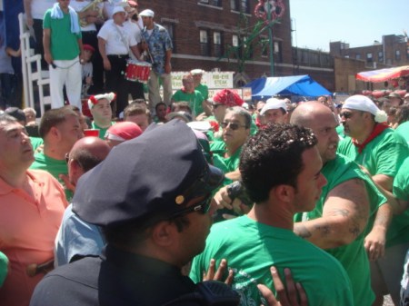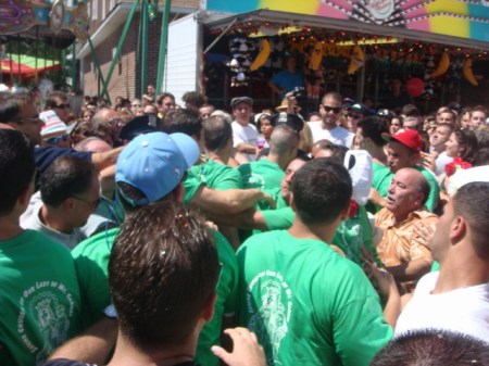 And, in response, the fight seemed to shift to a whole different area of the lift crew. Actually, it was in a sub-group that wasn’t even near the giglio. (In the picture below, you can see attention being drawn to that new area.)