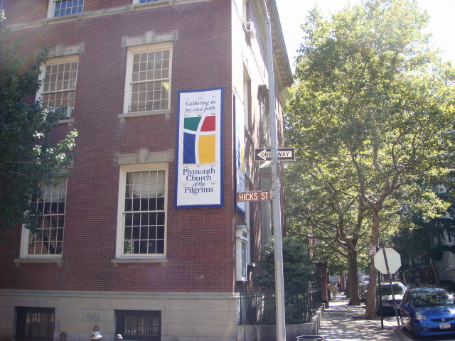 A plaque on the church reads “Plymouth Church of the Pilgrims founded in 1847 as Plymouth Church and built in 1849 from designs by J.C. Wells. This Congregational Church became a center of anti-slavery sentiment preceding the Civil War. Henry Ward Beecher was its first minister, 1847-1887. Abraham Lincoln worshipped here twice in 1860. A fragment of Plymouth Rock is in an adjoining arcade. In 1934 it was united with Church of the Pilgrims, founded in 1844. Plaque erected in 1961 by The New York Community Trust”
