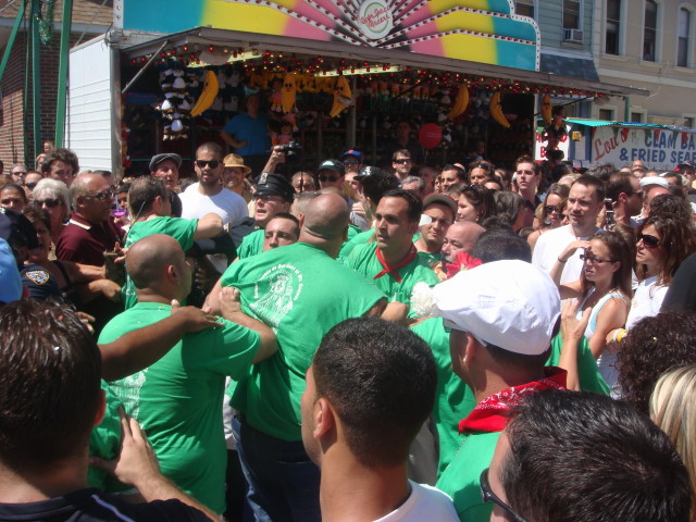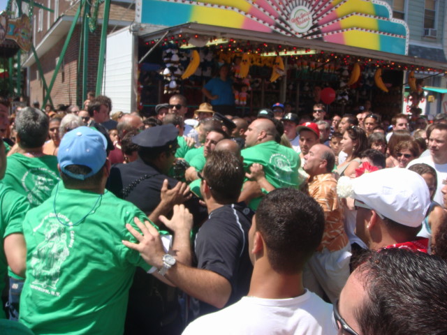 I gotta tell you: calling it a “fight” is a bit over the top. For the most part, it just was grappling and shoving. I think I may have seen one fist thrown, but I’m not sure about that. Mostly, the guys in the green shirts just sort of shifted around. There really wasn’t even any yelling. Apart from the cops, at least.