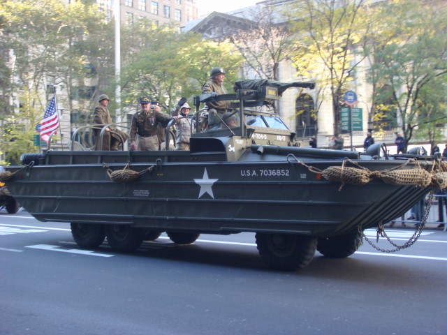 Afterward, one of the cool parts of the parade: vintage army vehicles. First came a “Duck“. These were used in WWII to cross waterways.